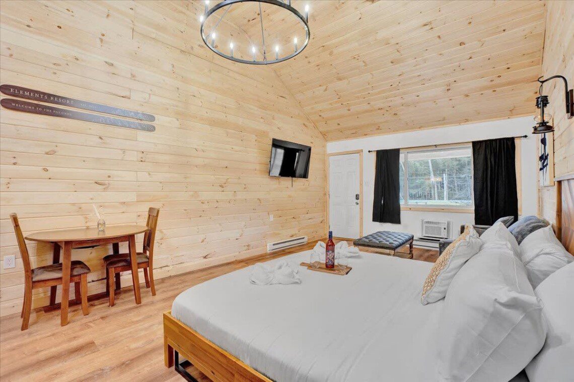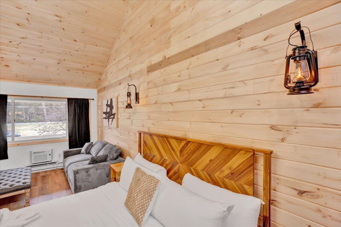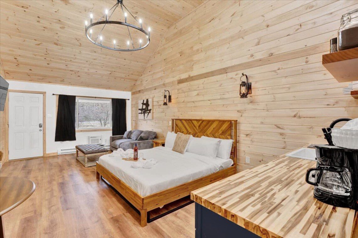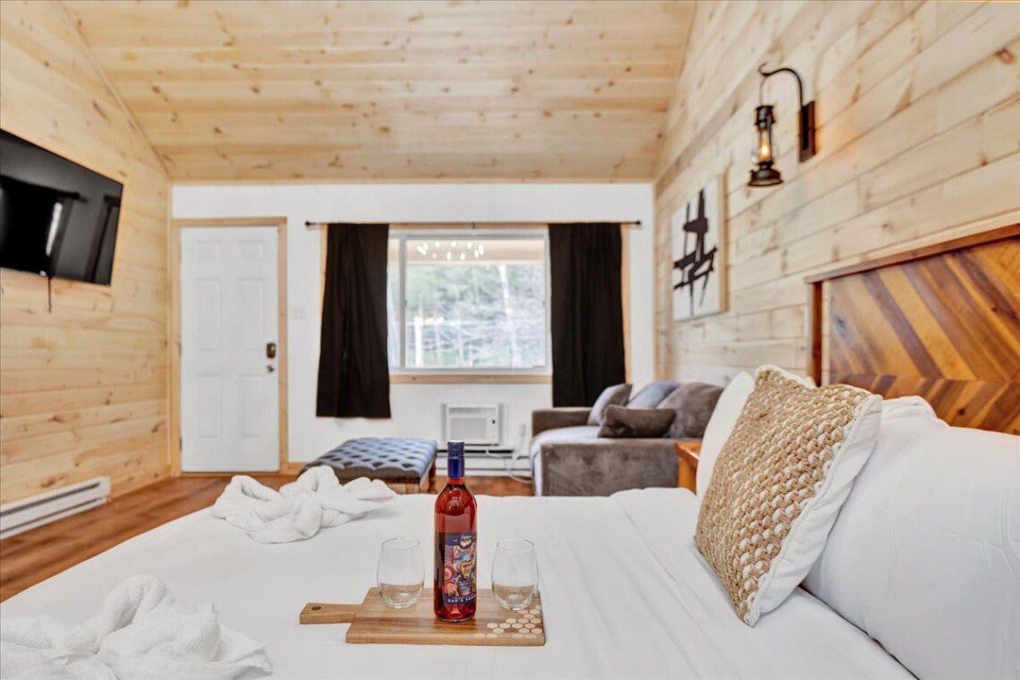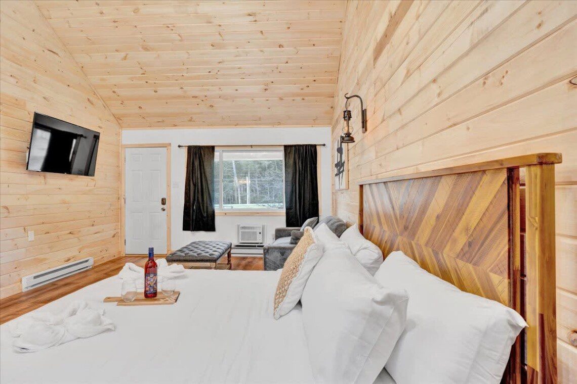 Nestle into your plush king mattress with cozy sheets and plenty of pillows, grab your favorite snacks and drinks, and enjoy your favorite TV show under vaulted pine ceilings