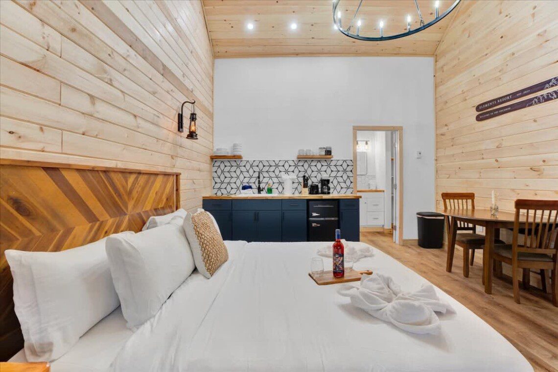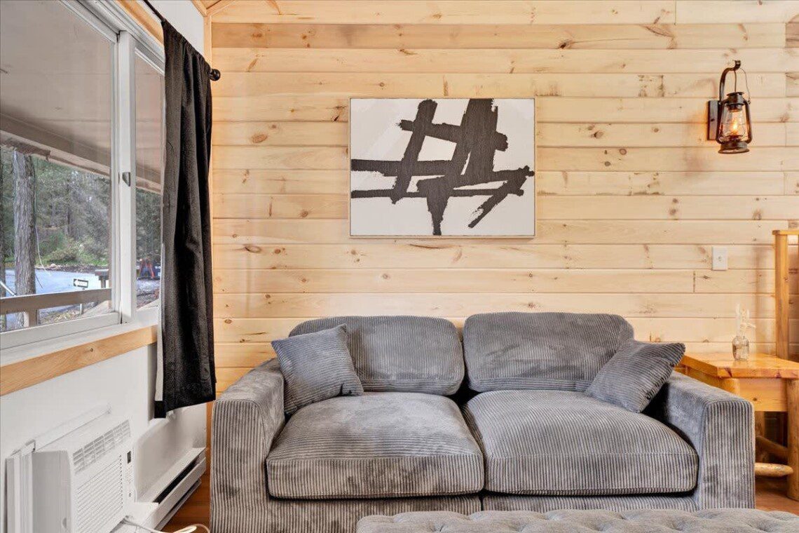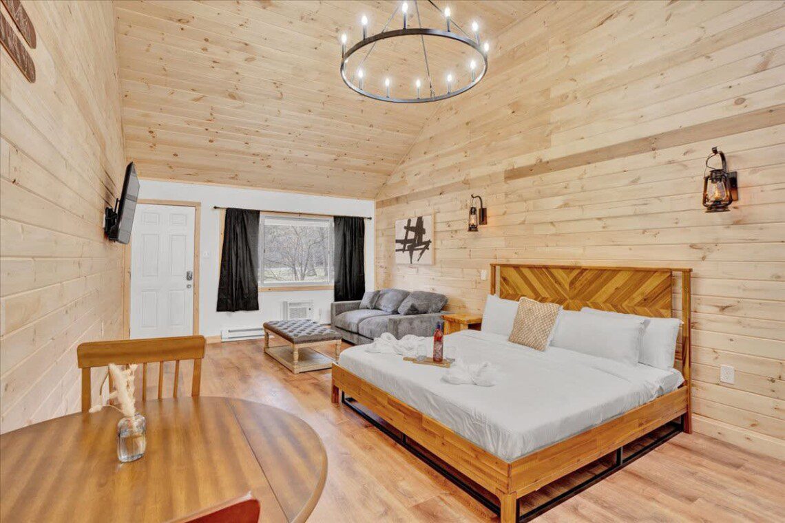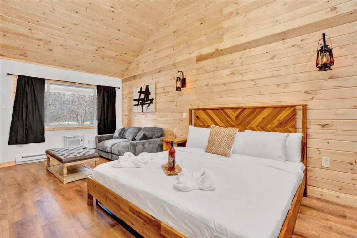 Have a relaxing stay in this charming cabin themed unit with modern amenities and tasteful décor, perfect to nestle up in on a snowy day as you watch the flakes fall gentle onto the pine trees around you.