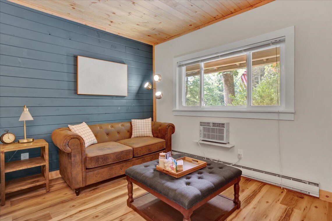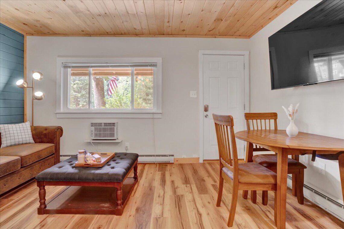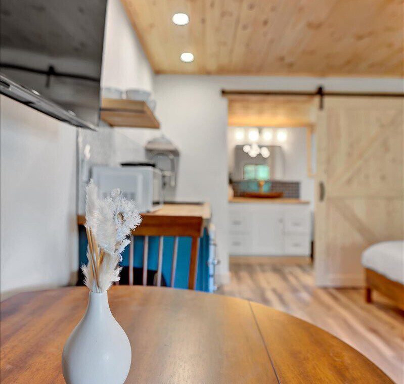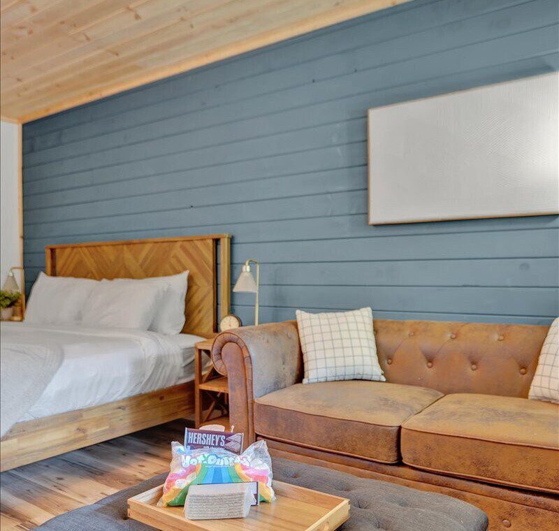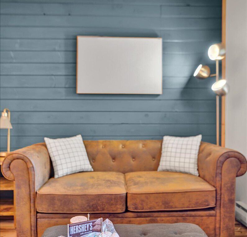 Have a relaxing stay in this charming cabin themed unit with modern amenities and tasteful décor, perfect to nestle up in on a snowy day as you watch the flakes fall gentle onto the pine trees around you.