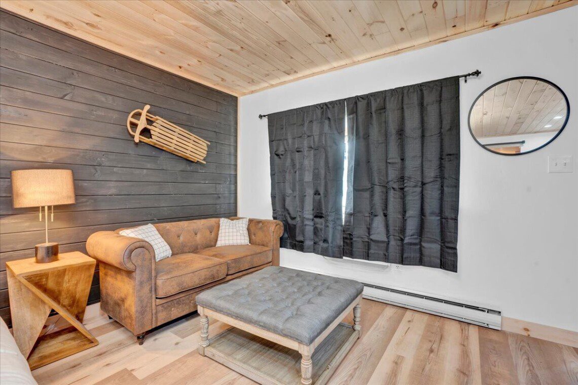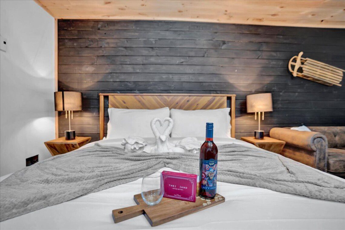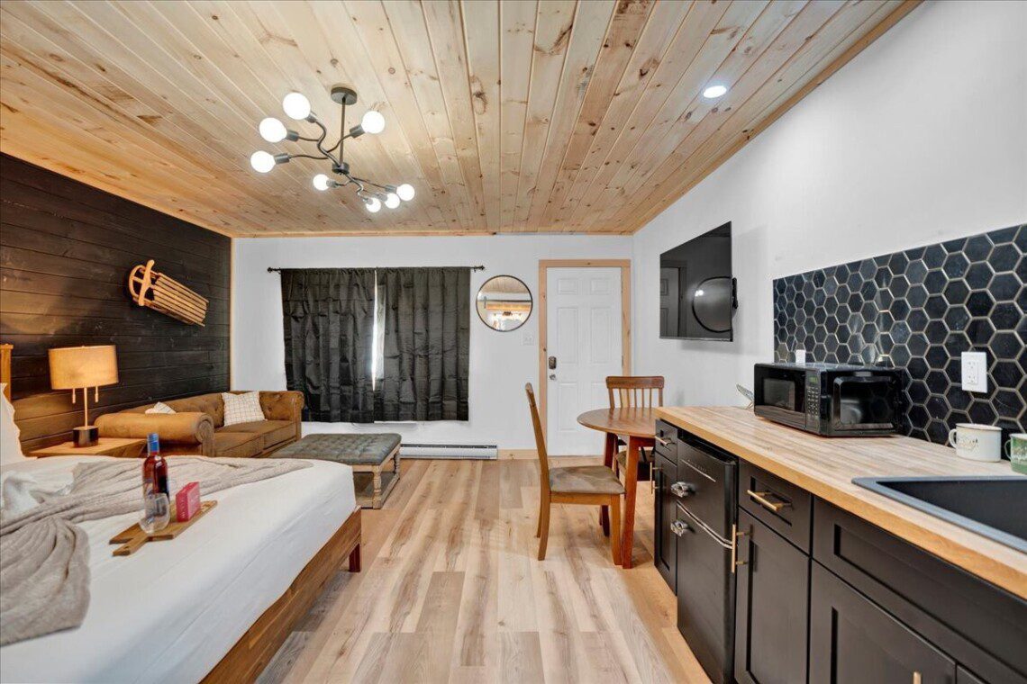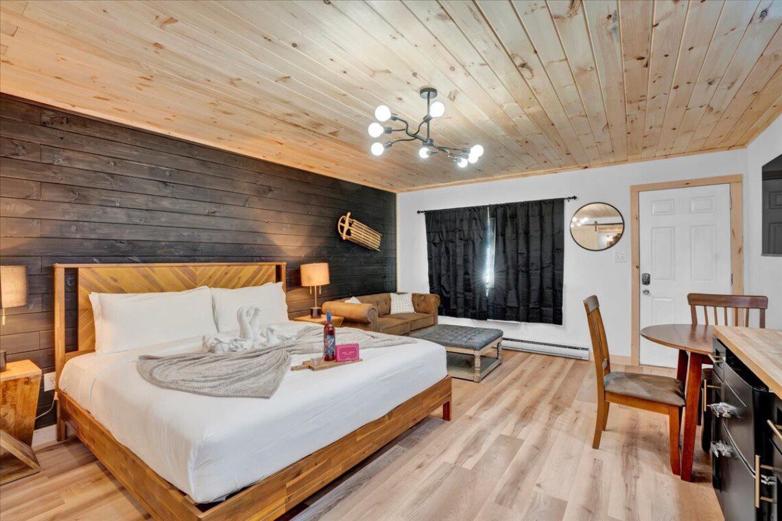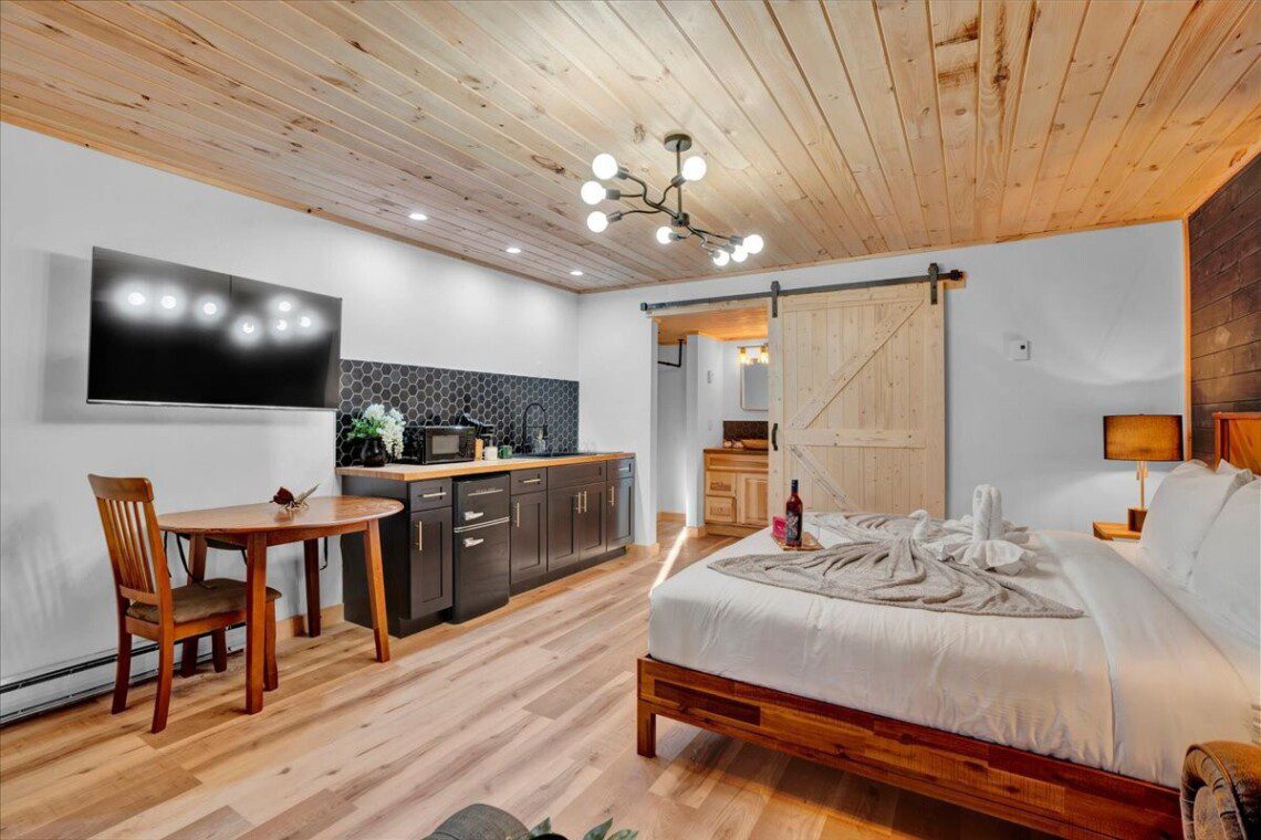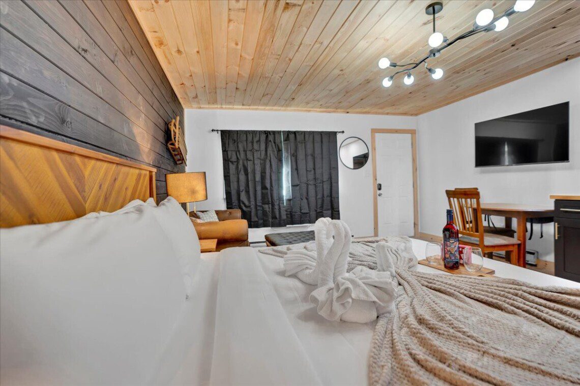 Have a relaxing stay in this charming cabin themed unit with modern amenities and tasteful décor, perfect to nestle up in on a snowy day as you watch the flakes fall gentle onto the pine trees around you.