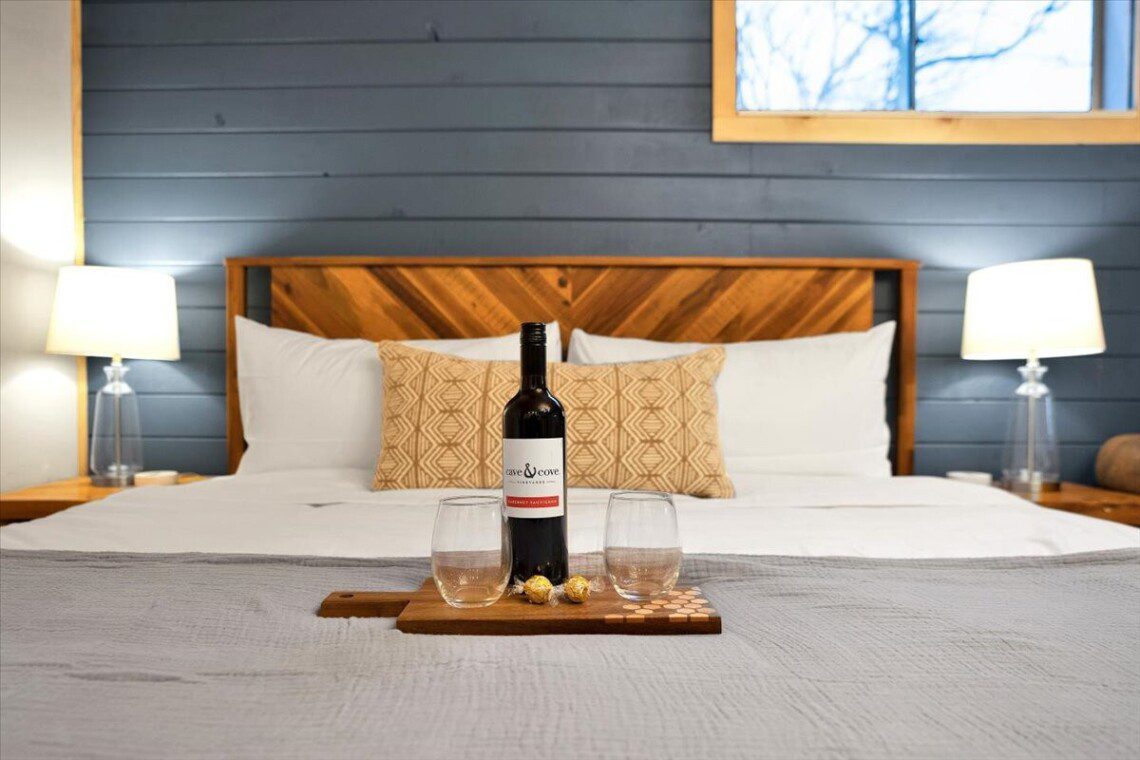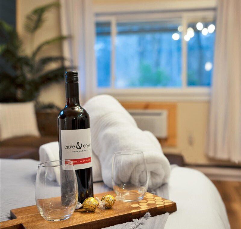 Have a relaxing stay in this charming cabin themed unit with modern amenities and tasteful décor, perfect to nestle up in on a snowy day as you watch the flakes fall gentle onto the pine trees around you.